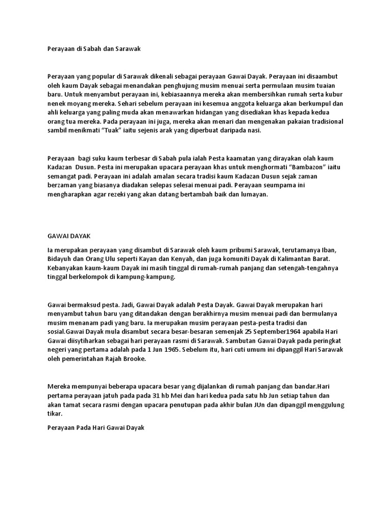 Related : Perayaan Di Sabah Dan Sarawak - Bagi suku kaum di sarawak seperti iban, bidayuh, orang ulu, perayaan hari gawai disambut pada 1 jun setiap tahun bagi menzahirkan tanda kesyukuran setelah selesai menuai..